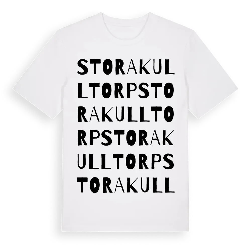 Stora Kulltorp ordlek t-shirt är inspirerad av byn Stora Kulltorp i Södermanlands län, Sverige. Tröjan är designad för dig som har en speciell koppling till platsen – oavsett om du bor här, har rötterna här eller bara älskar Stora Kulltorp.