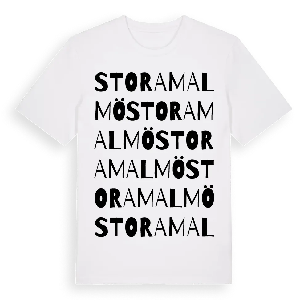 Stora Malmö ordlek t-shirt är inspirerad av byn Stora Malmö i Södermanlands län, Sverige. Tröjan är designad för dig som har en speciell koppling till platsen – oavsett om du bor här, har rötterna här eller bara älskar Stora Malmö.