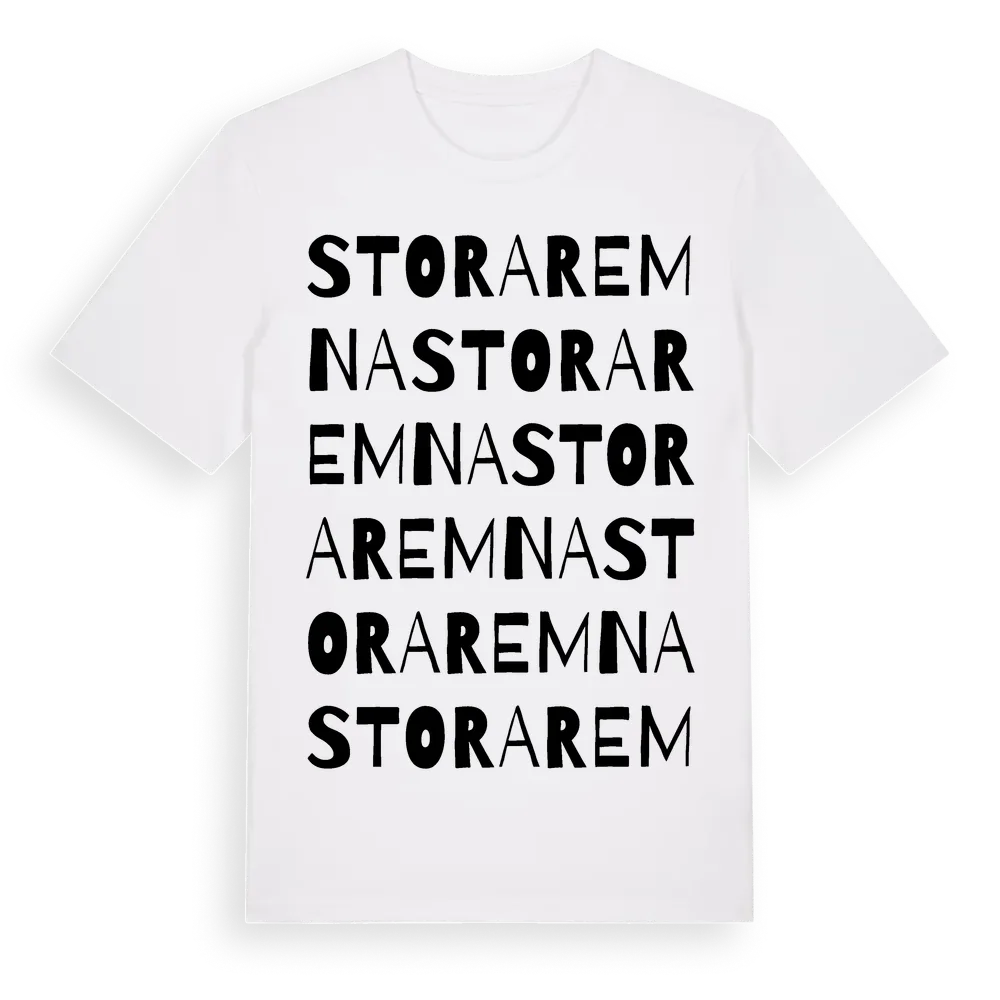 Stora Remna ordlek t-shirt är inspirerad av byn Stora Remna i Södermanlands län, Sverige. Tröjan är designad för dig som har en speciell koppling till platsen – oavsett om du bor här, har rötterna här eller bara älskar Stora Remna.