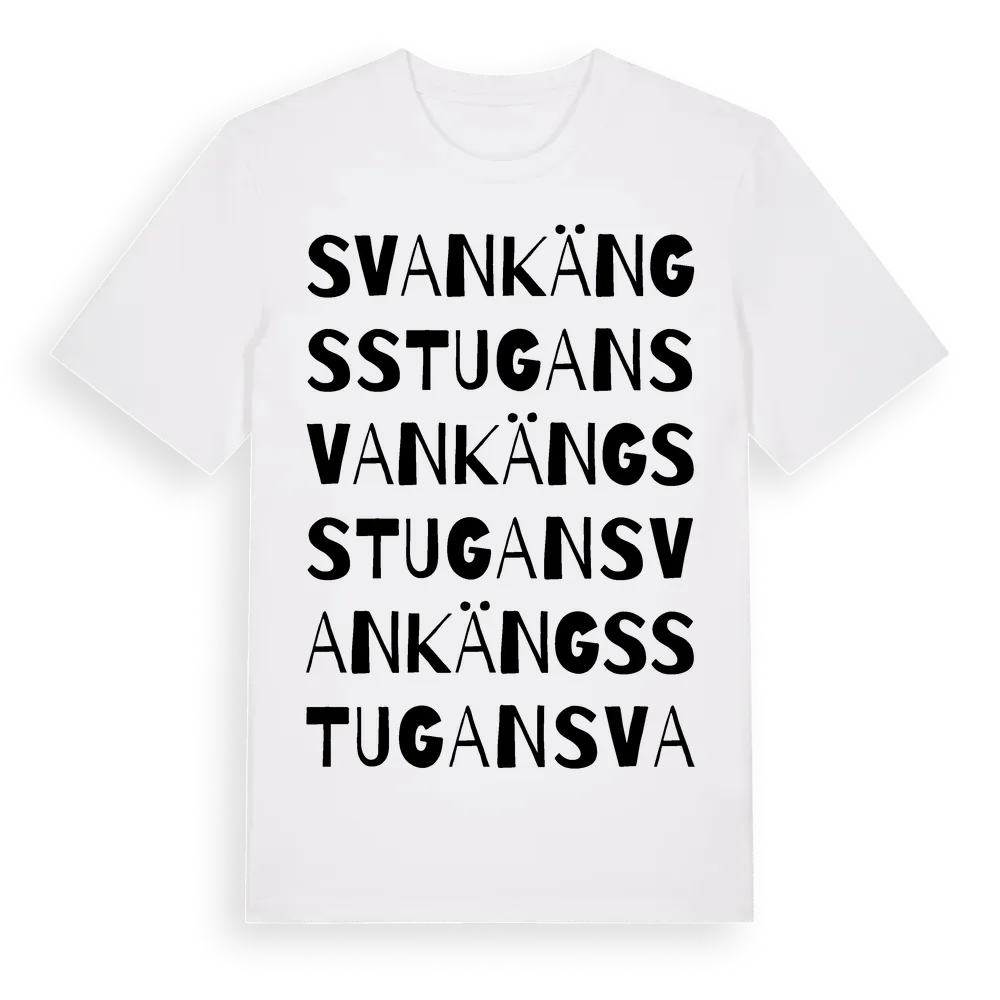 Svankängsstugan ordlek t-shirt är inspirerad av Svankängsstugan i Södermanlands län, Sverige. Tröjan är designad för dig som har en speciell koppling till platsen – oavsett om du bor här, har rötterna här eller bara älskar Svankängsstugan.