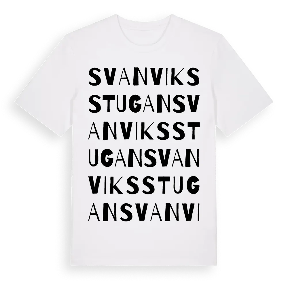 Svanviksstugan ordlek t-shirt är inspirerad av Svanviksstugan i Södermanlands län, Sverige. Tröjan är designad för dig som har en speciell koppling till platsen – oavsett om du bor här, har rötterna här eller bara älskar Svanviksstugan.
