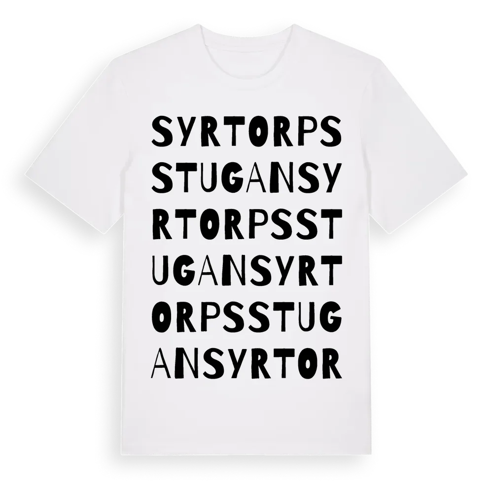 Syrtorpsstugan ordlek t-shirt är inspirerad av Syrtorpsstugan i Södermanlands län, Sverige. Tröjan är designad för dig som har en speciell koppling till platsen – oavsett om du bor här, har rötterna här eller bara älskar Syrtorpsstugan.