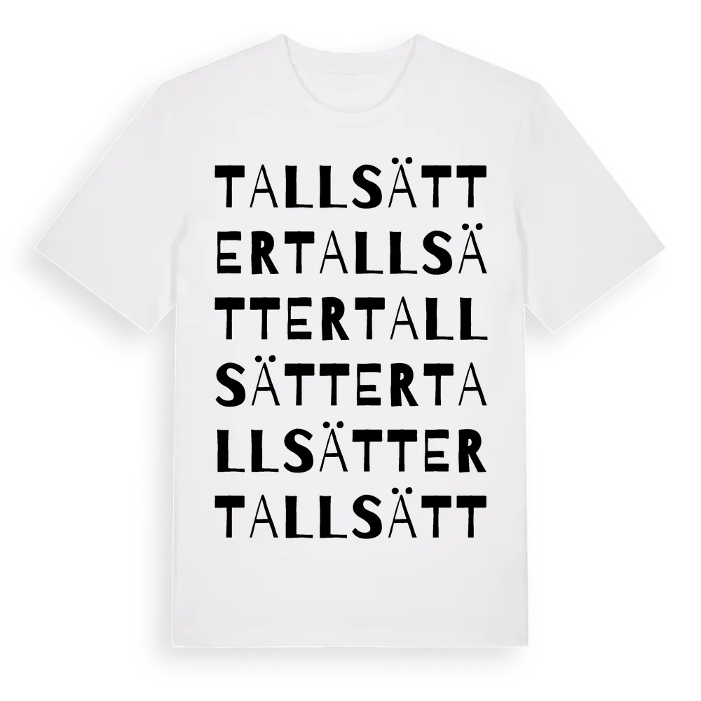 Tallsätter ordlek t-shirt är inspirerad av Tallsätter i Södermanlands län, Sverige. Tröjan är designad för dig som har en speciell koppling till platsen – oavsett om du bor här, har rötterna här eller bara älskar Tallsätter.
