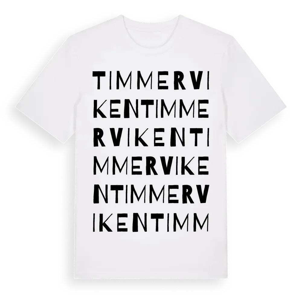 Timmerviken ordlek t-shirt är inspirerad av Timmerviken i Södermanlands län, Sverige. Tröjan är designad för dig som har en speciell koppling till platsen – oavsett om du bor här, har rötterna här eller bara älskar Timmerviken.
