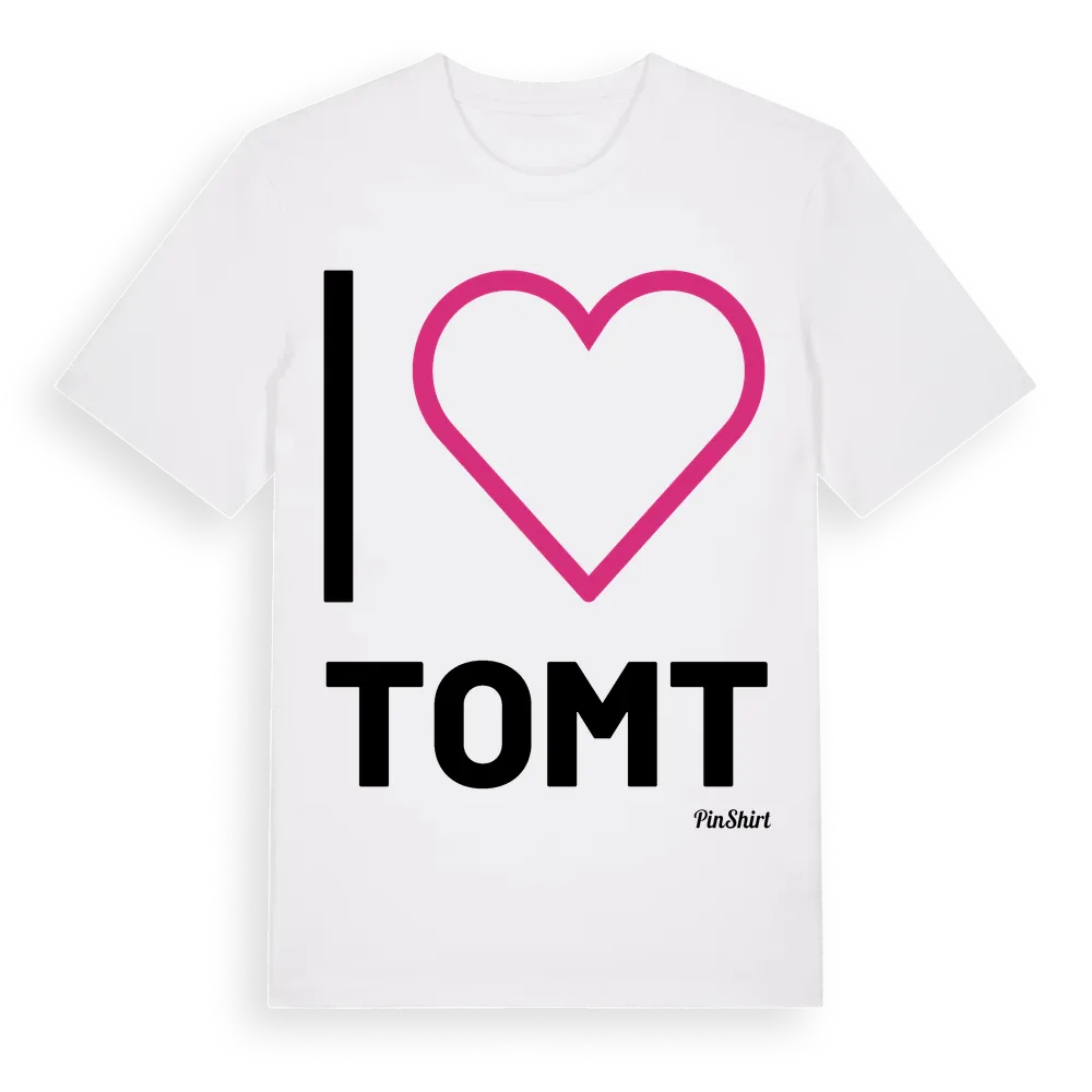 Jag älskar Tomt t-shirt stort tryck är inspirerad av Tomt i Södermanlands län, Sverige. Tröjan är designad för dig som har en speciell koppling till platsen – oavsett om du bor här, har rötterna här eller bara älskar Tomt.