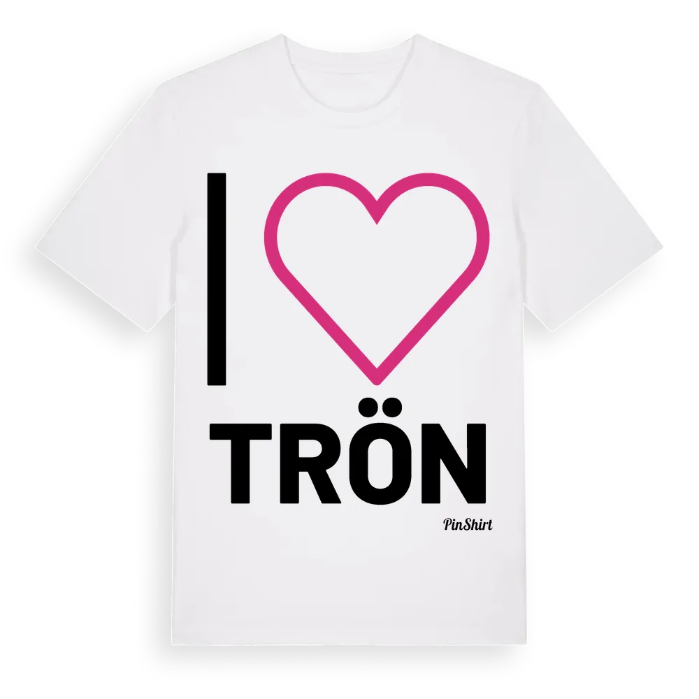 Det klassiska "I ❤ Trön"-motivet i stort format som täcker hela bröstet. För dig som vill visa kärleken till Trön på riktigt. Premium bomull, unisex – från Trön i Södermanlands län.