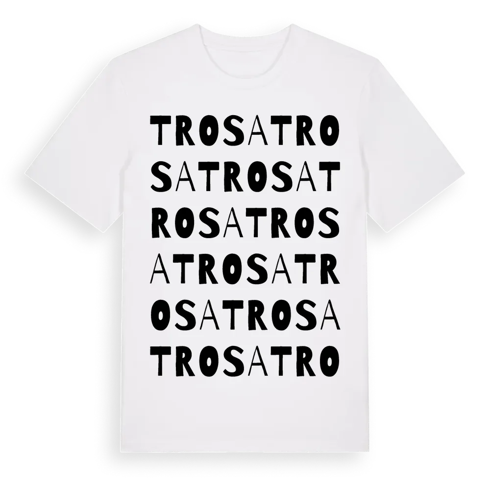 En ordlek byggd på Trosas namn. Subtilt och klurig – ett motiv som bara de som verkligen känner platsen fullt ut förstår. Premium bomull, unisex – från staden Trosa i Södermanlands län.