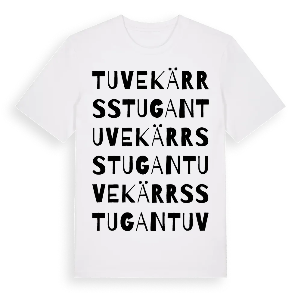 Tuvekärrsstugan ordlek t-shirt är inspirerad av Tuvekärrsstugan i Södermanlands län, Sverige. Tröjan är designad för dig som har en speciell koppling till platsen – oavsett om du bor här, har rötterna här eller bara älskar Tuvekärrsstugan.