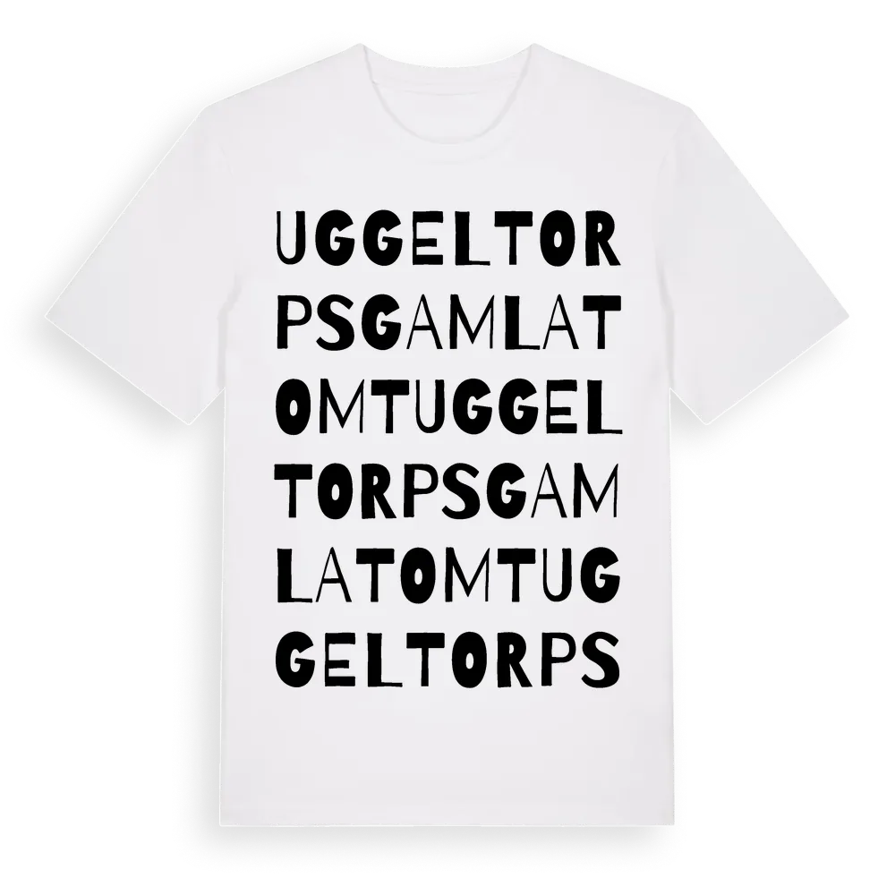 Uggeltorps Gamla Tomt ordlek t-shirt är inspirerad av Uggeltorps Gamla Tomt i Södermanlands län, Sverige. Tröjan är designad för dig som har en speciell koppling till platsen – oavsett om du bor här, har rötterna här eller bara älskar Uggeltorps Gamla Tomt.