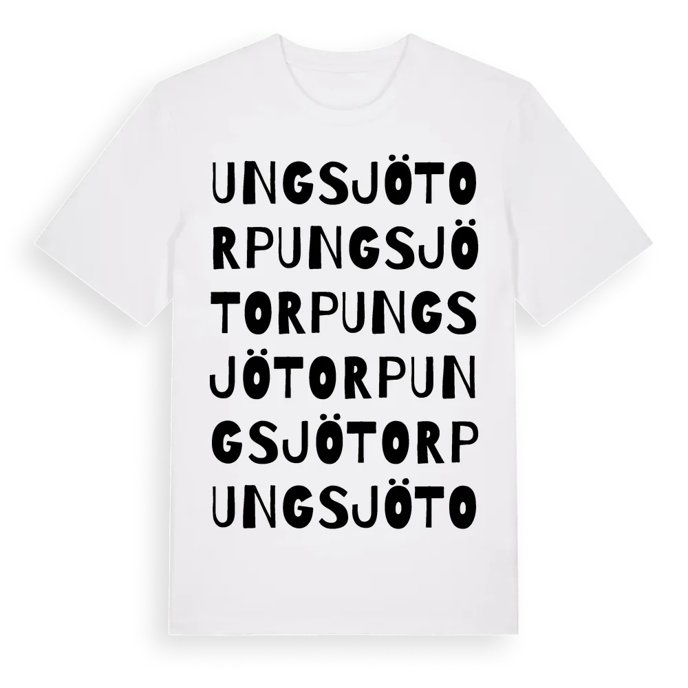 Ungsjötorp ordlek t-shirt är inspirerad av Ungsjötorp i Södermanlands län, Sverige. Tröjan är designad för dig som har en speciell koppling till platsen – oavsett om du bor här, har rötterna här eller bara älskar Ungsjötorp.