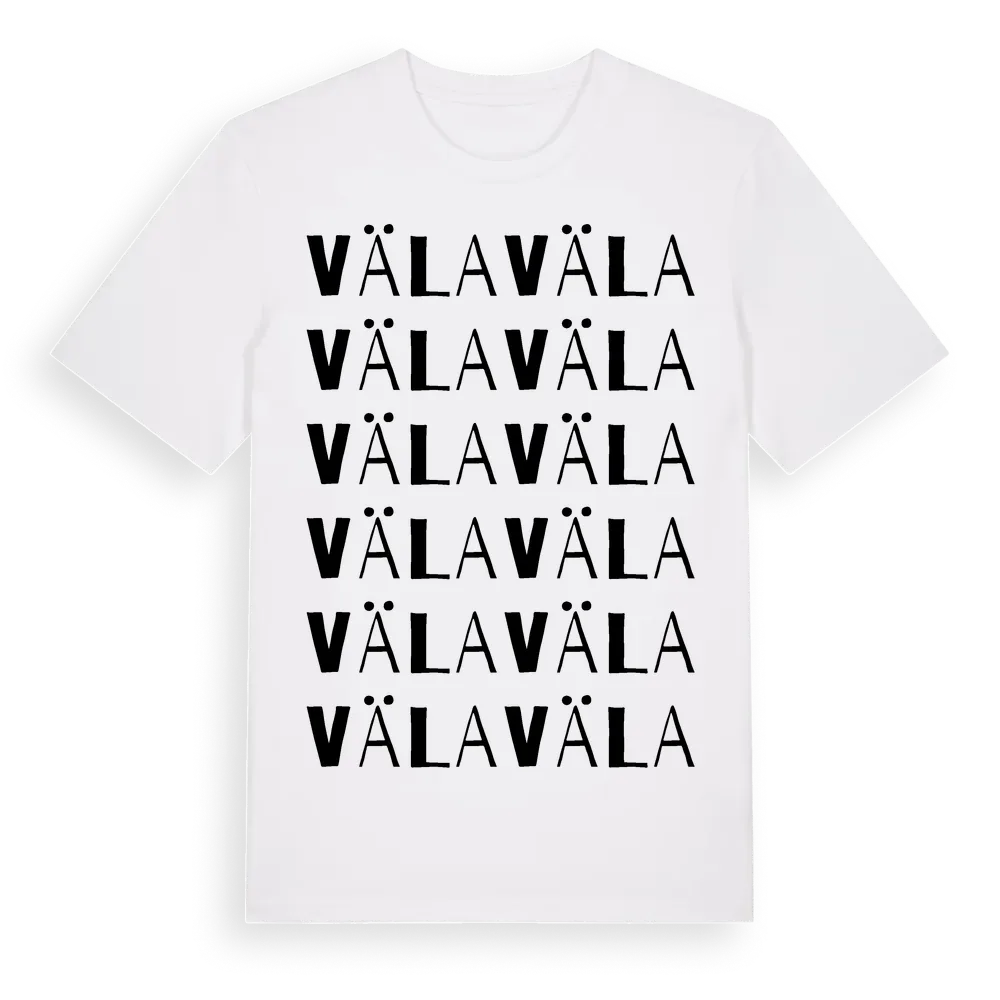 En ordlek byggd på Välas namn. Subtilt och klurig – ett motiv som bara de som verkligen känner platsen fullt ut förstår. Premium bomull, unisex – från byn Väla i Södermanlands län.