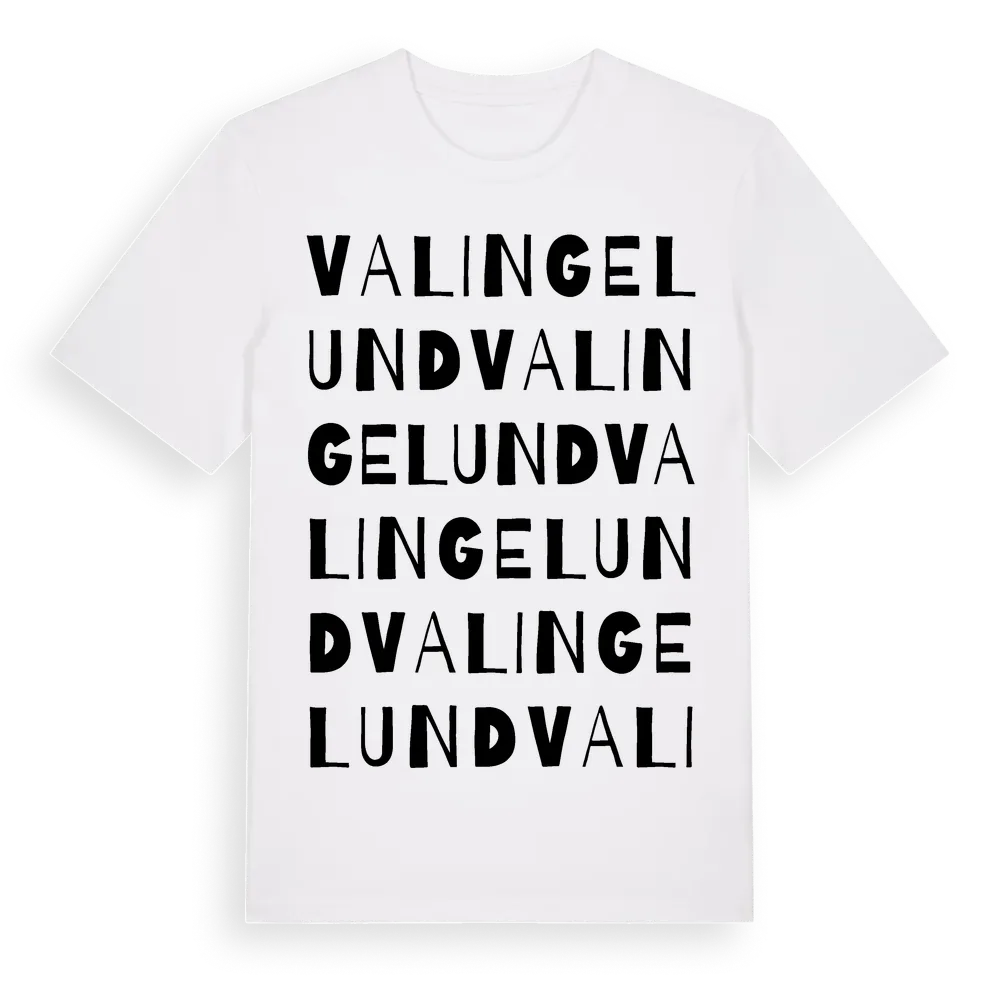 Valingelund ordlek t-shirt är inspirerad av Valingelund i Södermanlands län, Sverige. Tröjan är designad för dig som har en speciell koppling till platsen – oavsett om du bor här, har rötterna här eller bara älskar Valingelund.