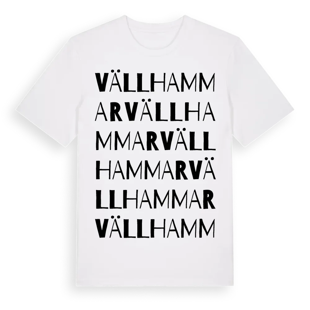 Vällhammar ordlek t-shirt är inspirerad av Vällhammar i Södermanlands län, Sverige. Tröjan är designad för dig som har en speciell koppling till platsen – oavsett om du bor här, har rötterna här eller bara älskar Vällhammar.