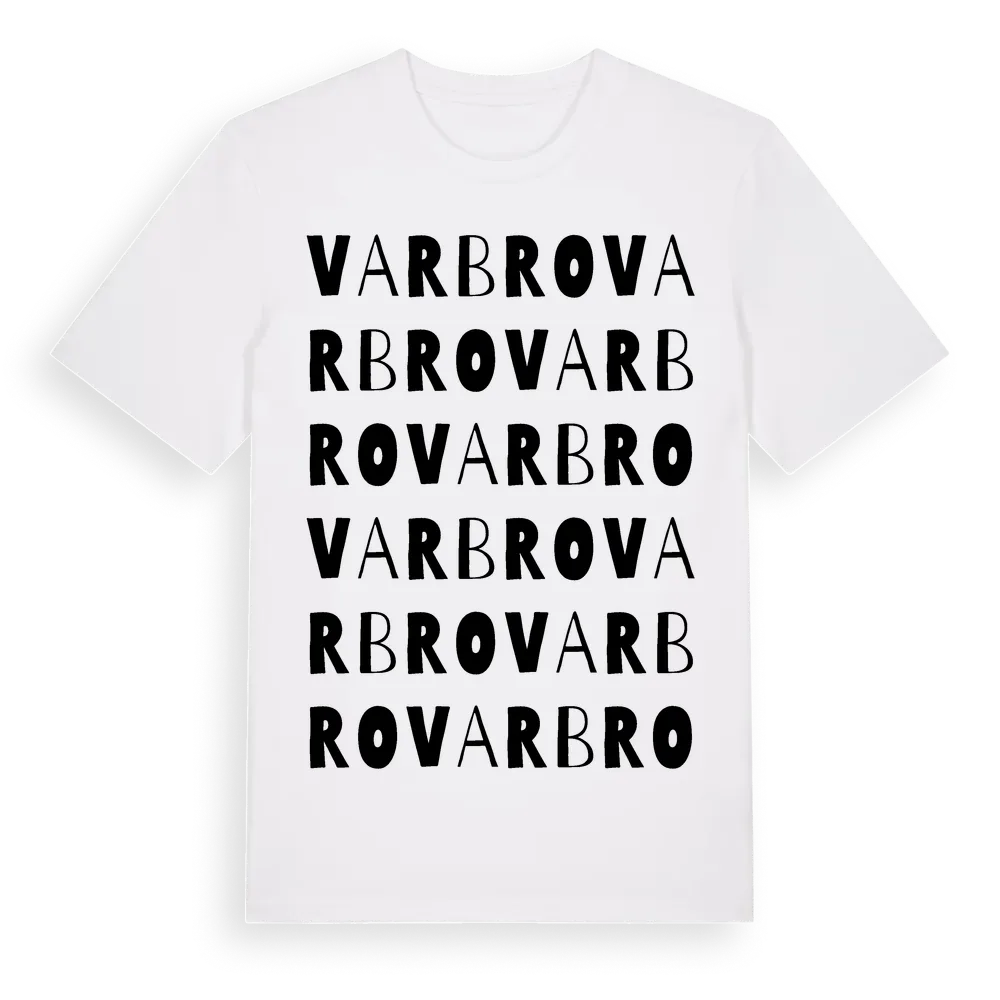 Varbro ordlek t-shirt är inspirerad av byn Varbro i Södermanlands län, Sverige. Tröjan är designad för dig som har en speciell koppling till platsen – oavsett om du bor här, har rötterna här eller bara älskar Varbro.
