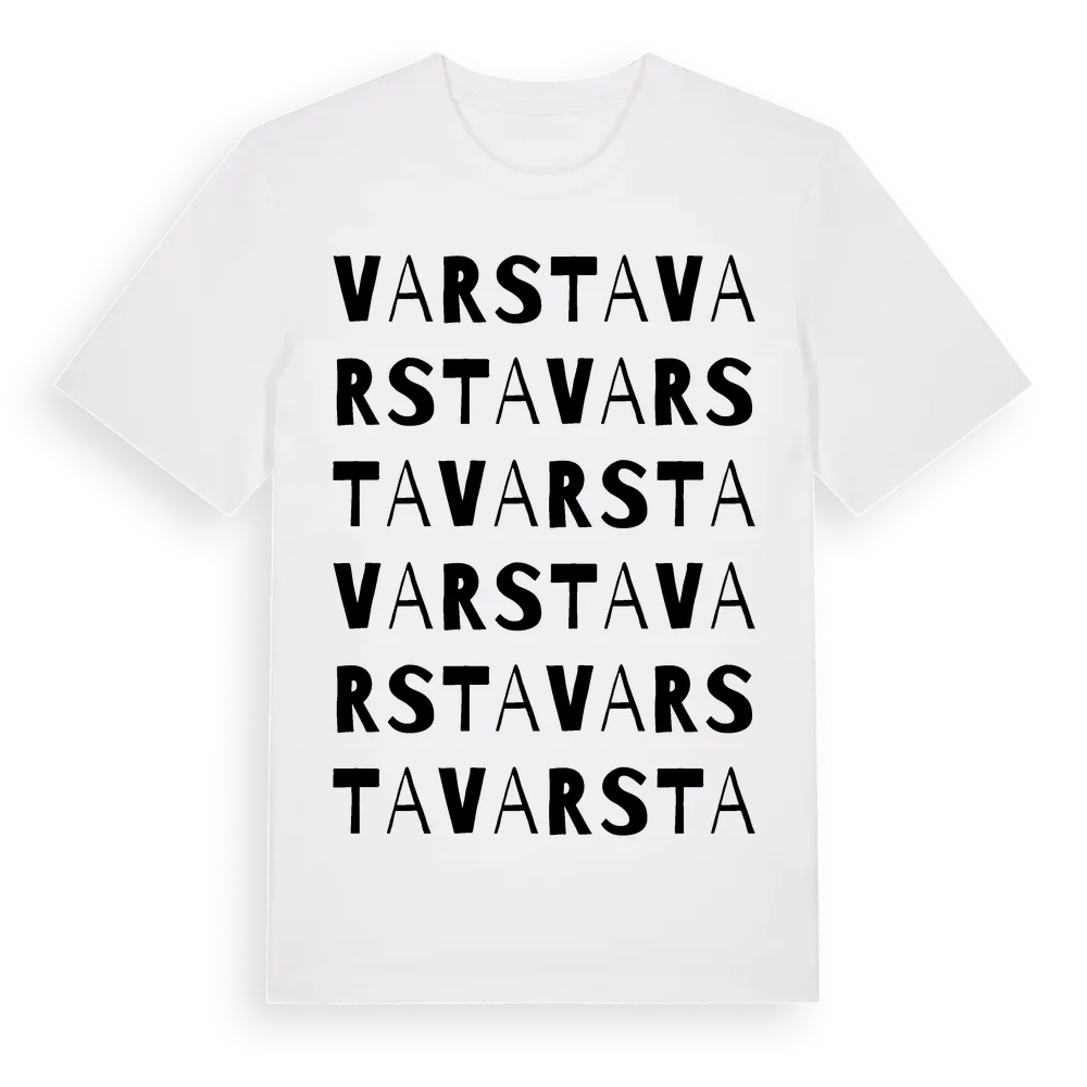 Varsta ordlek t-shirt är inspirerad av byn Varsta i Södermanlands län, Sverige. Tröjan är designad för dig som har en speciell koppling till platsen – oavsett om du bor här, har rötterna här eller bara älskar Varsta.