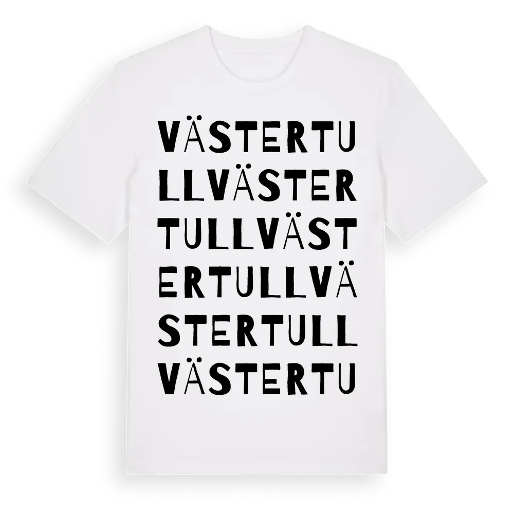 Västertull ordlek t-shirt är inspirerad av Västertull i Södermanlands län, Sverige. Tröjan är designad för dig som har en speciell koppling till platsen – oavsett om du bor här, har rötterna här eller bara älskar Västertull.