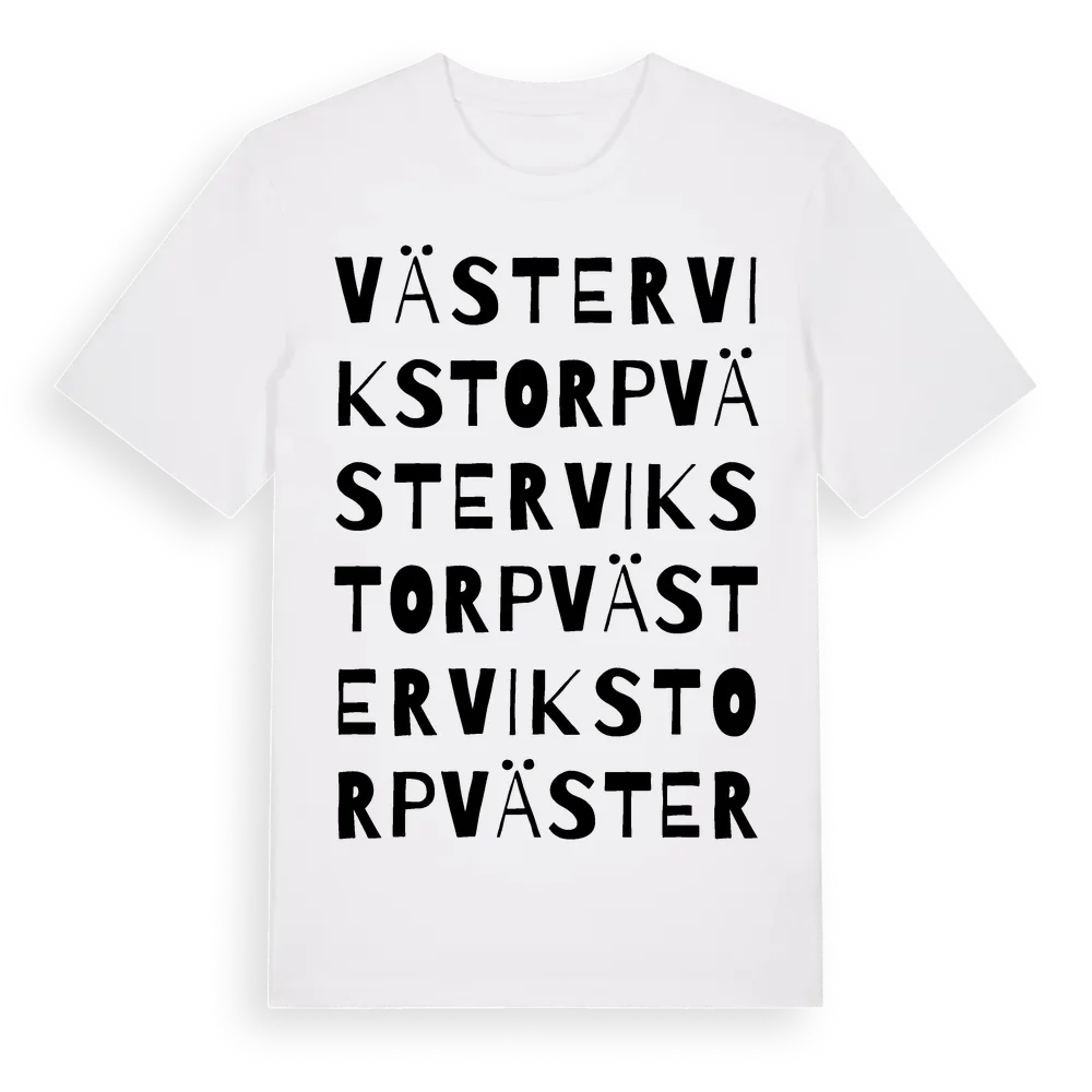 Västervikstorp ordlek t-shirt är inspirerad av Västervikstorp i Södermanlands län, Sverige. Tröjan är designad för dig som har en speciell koppling till platsen – oavsett om du bor här, har rötterna här eller bara älskar Västervikstorp.