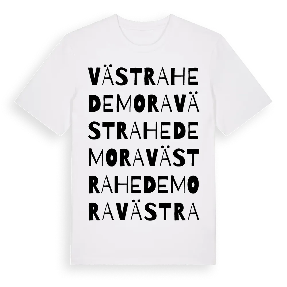 Västra Hedemora ordlek t-shirt är inspirerad av byn Västra Hedemora i Södermanlands län, Sverige. Tröjan är designad för dig som har en speciell koppling till platsen – oavsett om du bor här, har rötterna här eller bara älskar Västra Hedemora.