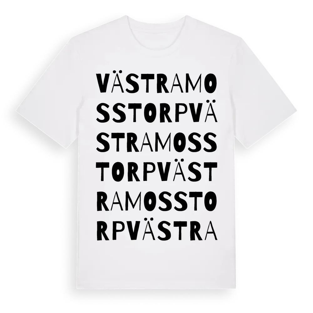 Västra Mosstorp ordlek t-shirt är inspirerad av Västra Mosstorp i Södermanlands län, Sverige. Tröjan är designad för dig som har en speciell koppling till platsen – oavsett om du bor här, har rötterna här eller bara älskar Västra Mosstorp.
