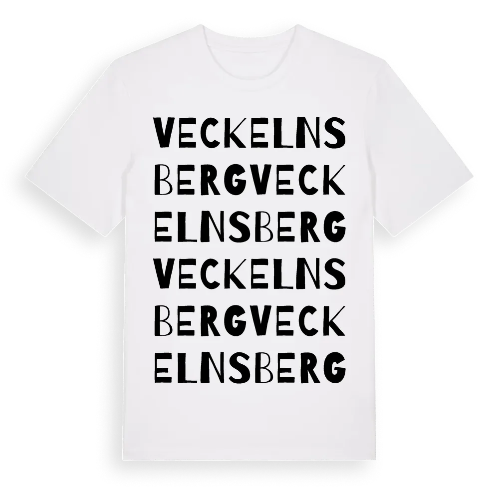 Veckelnsberg ordlek t-shirt är inspirerad av byn Veckelnsberg i Södermanlands län, Sverige. Tröjan är designad för dig som har en speciell koppling till platsen – oavsett om du bor här, har rötterna här eller bara älskar Veckelnsberg.