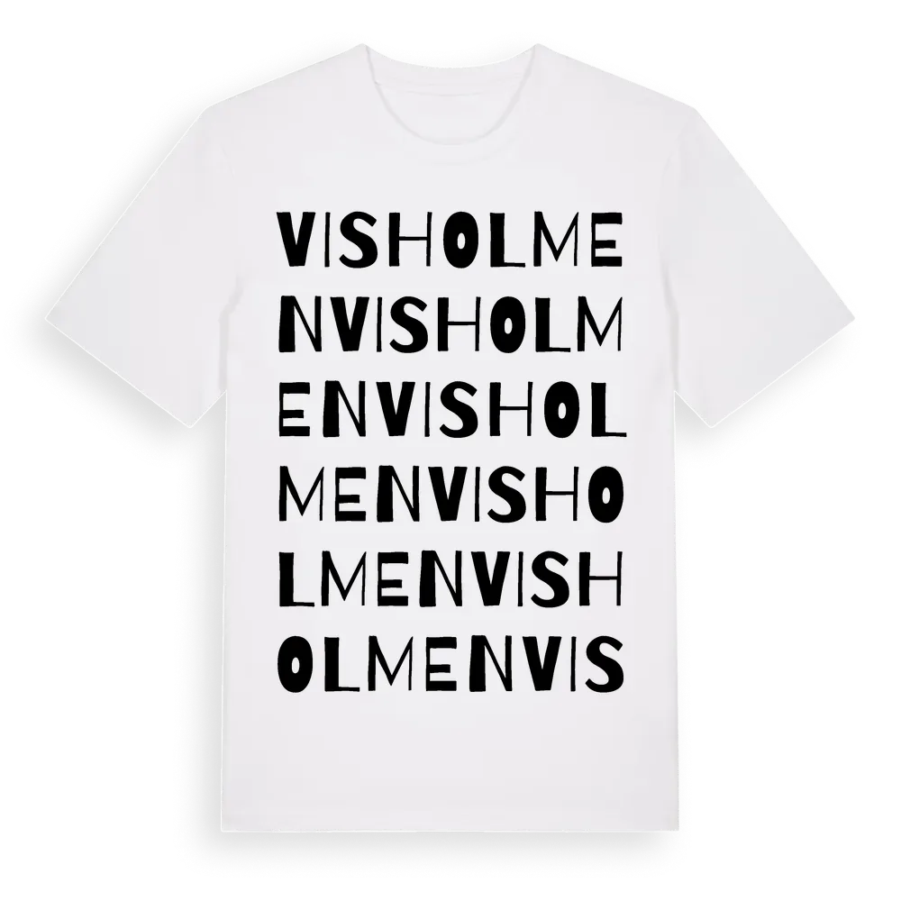 En ordlek byggd på Visholmens namn. Subtilt och klurig – ett motiv som bara de som verkligen känner platsen fullt ut förstår. Premium bomull, unisex – från Visholmen i Södermanlands län.