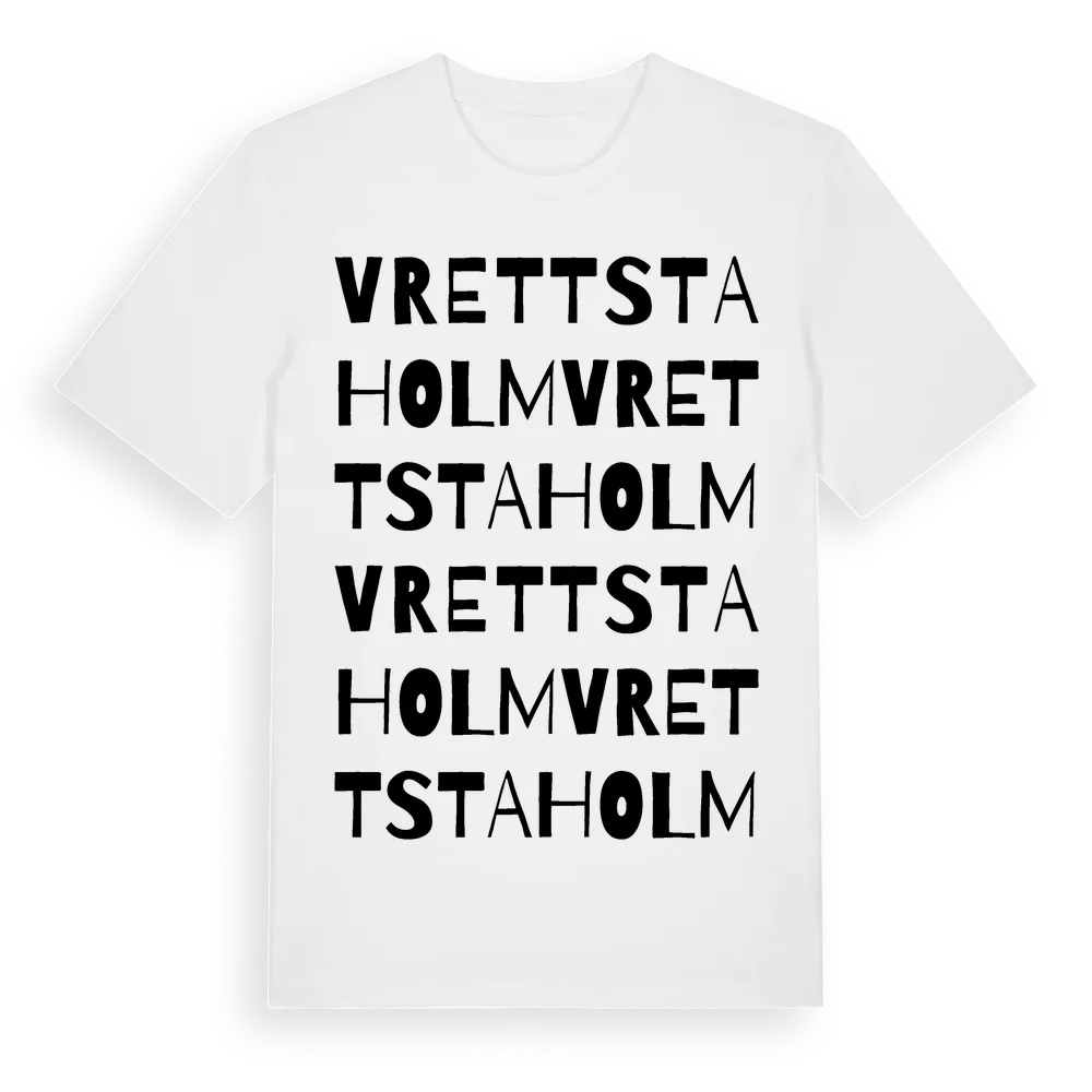 Vrettstaholm ordlek t-shirt är inspirerad av Vrettstaholm i Södermanlands län, Sverige. Tröjan är designad för dig som har en speciell koppling till platsen – oavsett om du bor här, har rötterna här eller bara älskar Vrettstaholm.