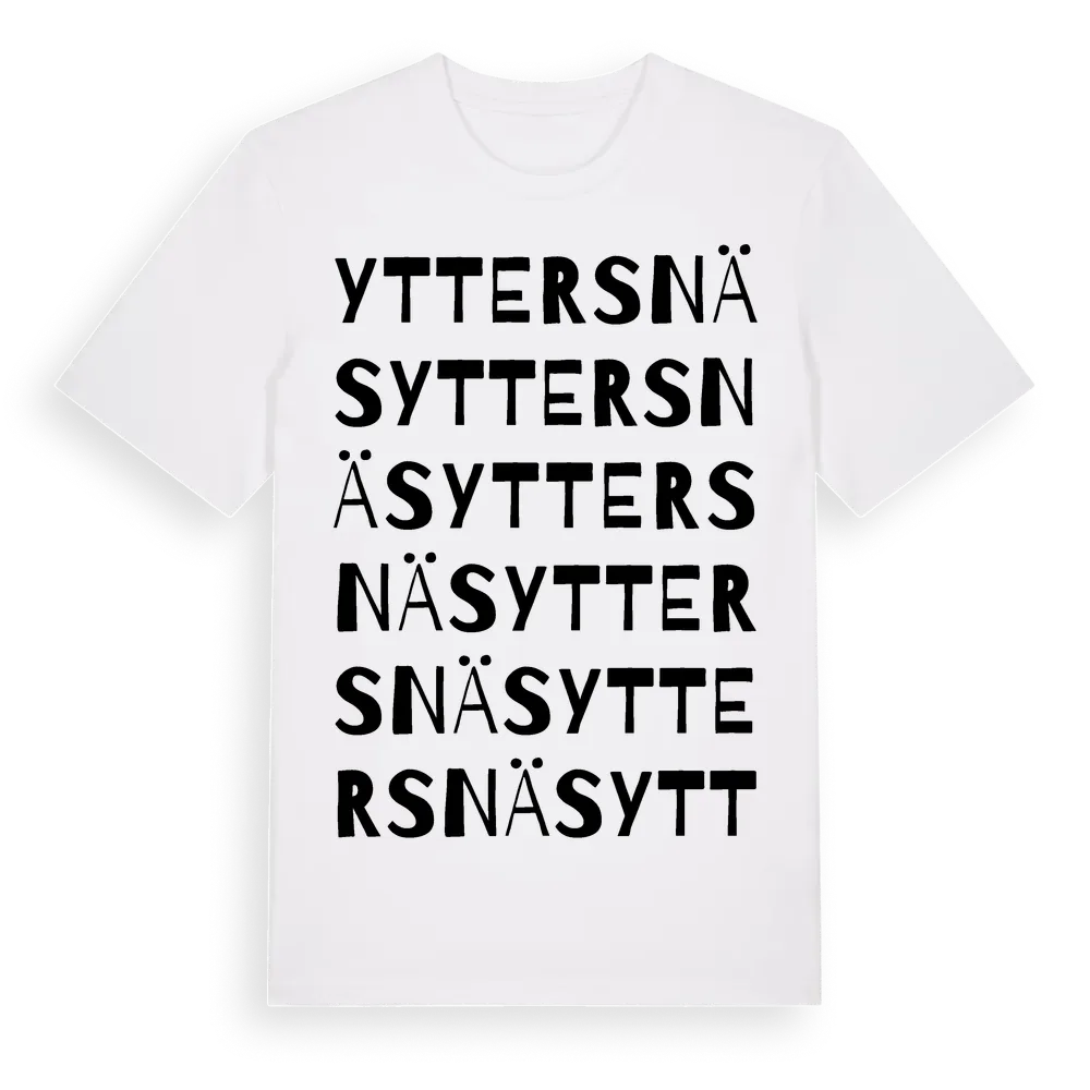 En ordlek byggd på Yttersnäss namn. Subtilt och klurig – ett motiv som bara de som verkligen känner platsen fullt ut förstår. Premium bomull, unisex – från Yttersnäs i Södermanlands län.
