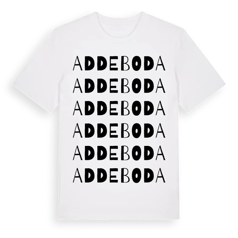 En ordlek byggd på Addebodas namn. Subtilt och klurig – ett motiv som bara de som verkligen känner platsen fullt ut förstår. Premium bomull, unisex – från byn Addeboda i Stockholms län.