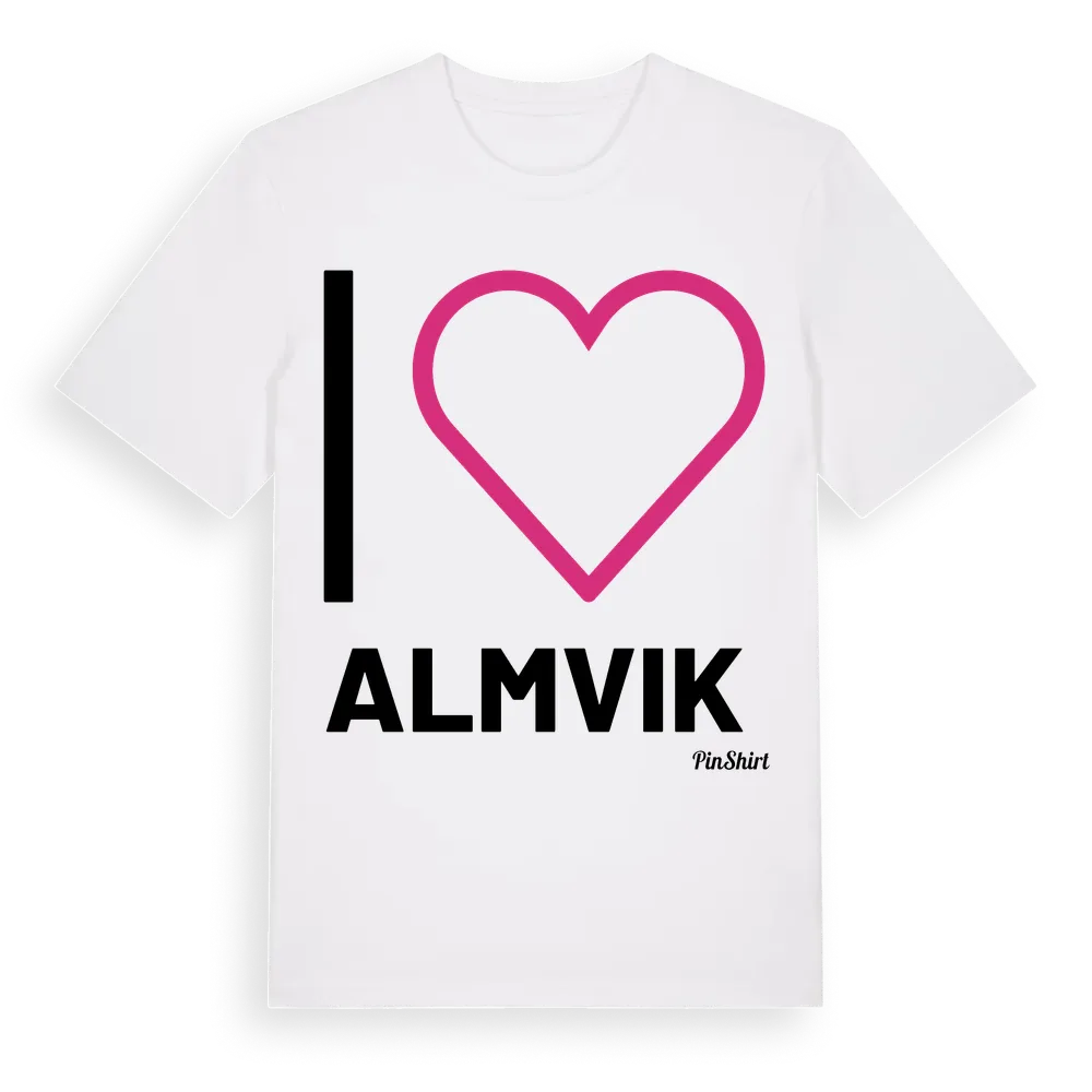 Det klassiska "I ❤ Almvik"-motivet i stort format som täcker hela bröstet. För dig som vill visa kärleken till Almvik på riktigt. Premium bomull, unisex – från Almvik i Stockholms län.
