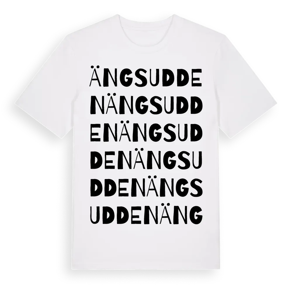 Ängsudden ordlek t-shirt är inspirerad av Ängsudden i Stockholms län, Sverige. Tröjan är designad för dig som har en speciell koppling till platsen – oavsett om du bor här, har rötterna här eller bara älskar Ängsudden.