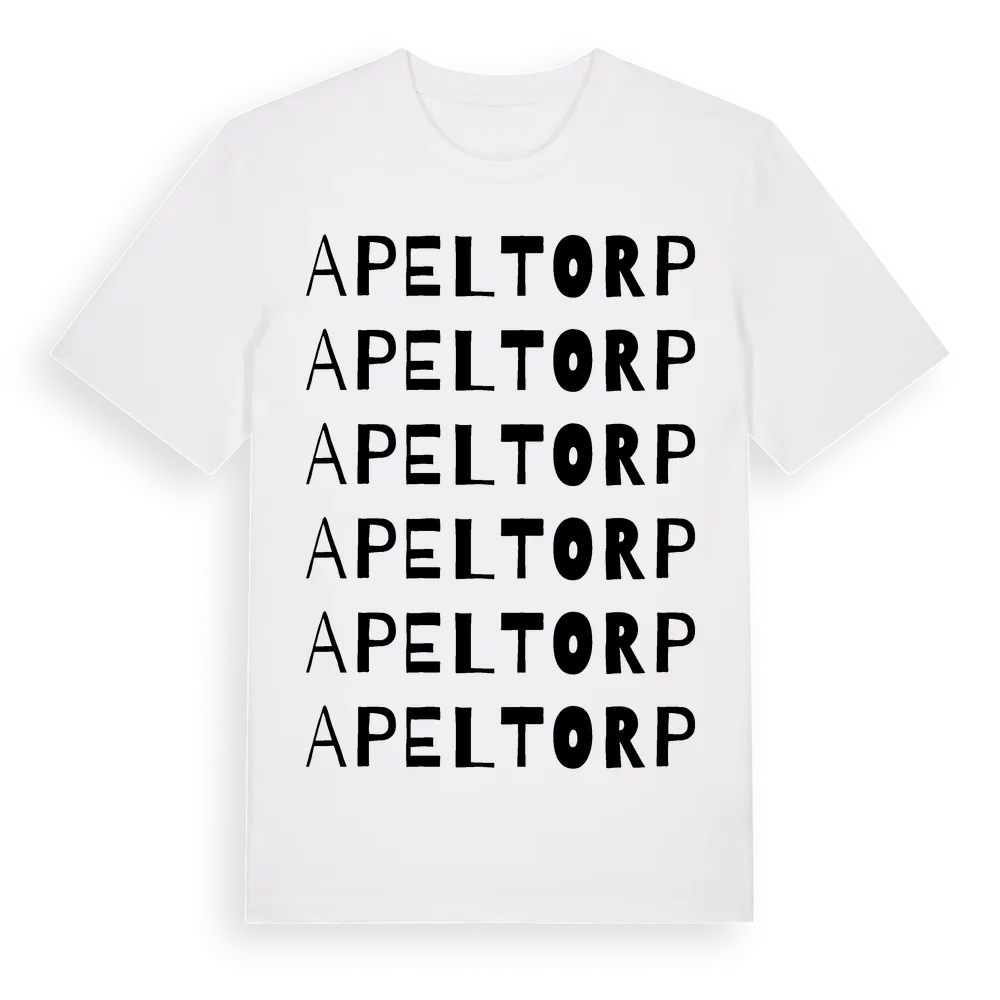 En ordlek byggd på Apeltorps namn. Subtilt och klurig – ett motiv som bara de som verkligen känner platsen fullt ut förstår. Premium bomull, unisex – från Apeltorp i Stockholms län.