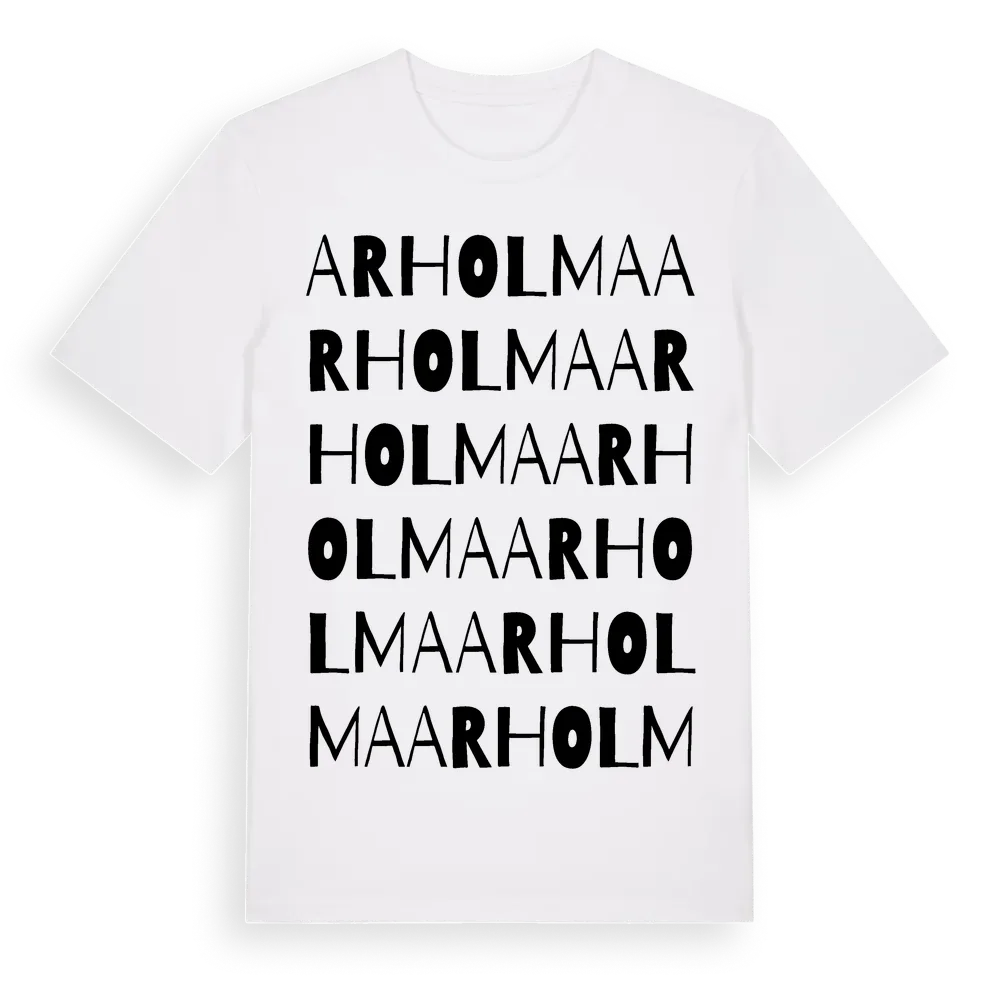 En ordlek byggd på Arholmas namn. Subtilt och klurig – ett motiv som bara de som verkligen känner platsen fullt ut förstår. Premium bomull, unisex – från ön Arholma i Stockholms län.