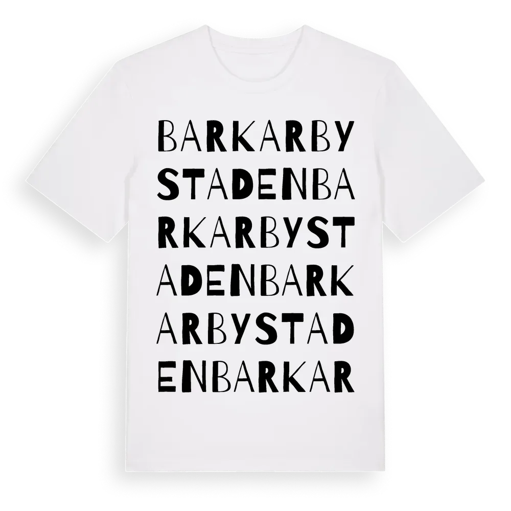 Barkarbystaden ordlek t-shirt är inspirerad av stadsdelen Barkarbystaden i Stockholms län, Sverige. Tröjan är designad för dig som har en speciell koppling till platsen – oavsett om du bor här, har rötterna här eller bara älskar Barkarbystaden.