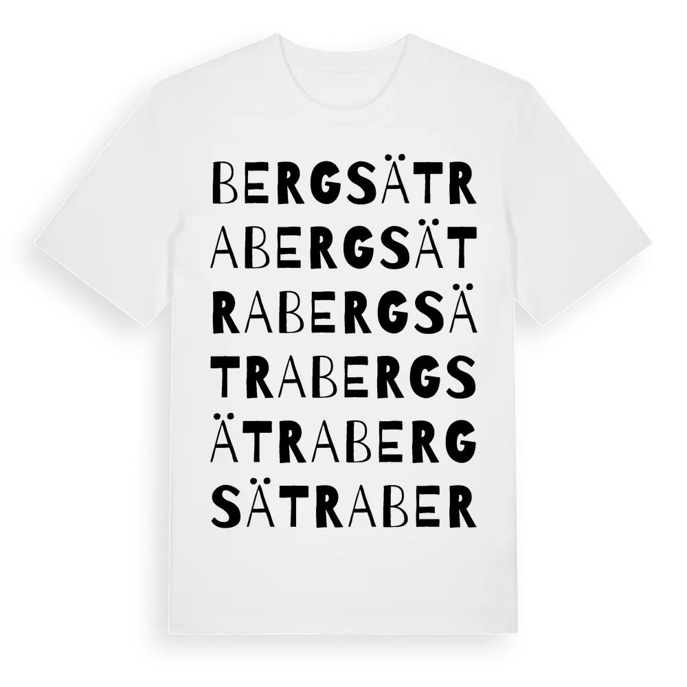 Bergsätra ordlek t-shirt är inspirerad av Bergsätra i Stockholms län, Sverige. Tröjan är designad för dig som har en speciell koppling till platsen – oavsett om du bor här, har rötterna här eller bara älskar Bergsätra.