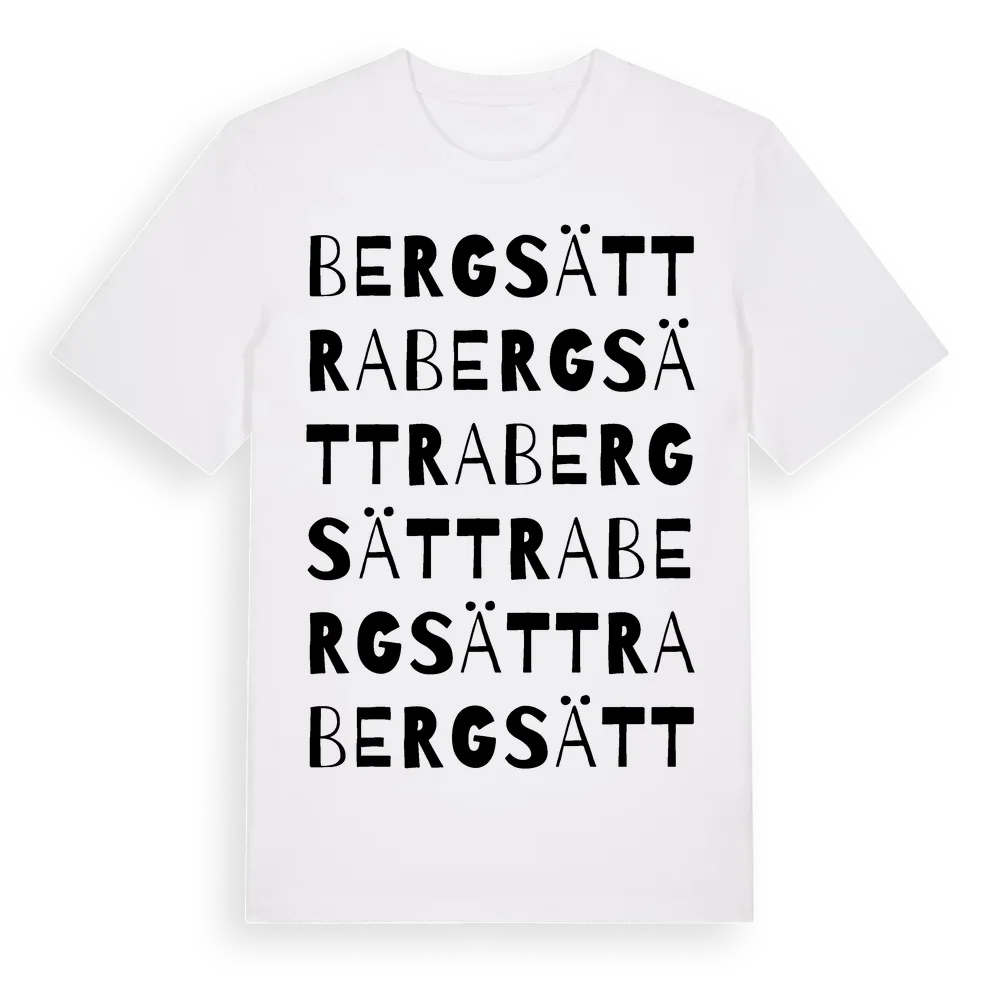 Bergsättra ordlek t-shirt är inspirerad av byn Bergsättra i Stockholms län, Sverige. Tröjan är designad för dig som har en speciell koppling till platsen – oavsett om du bor här, har rötterna här eller bara älskar Bergsättra.