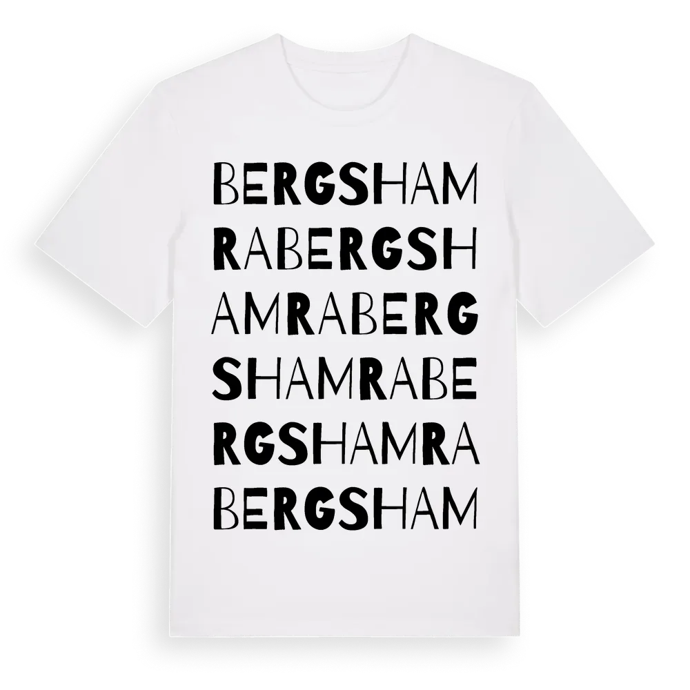 Bergshamra ordlek t-shirt är inspirerad av byn Bergshamra i Stockholms län, Sverige. Tröjan är designad för dig som har en speciell koppling till platsen – oavsett om du bor här, har rötterna här eller bara älskar Bergshamra.