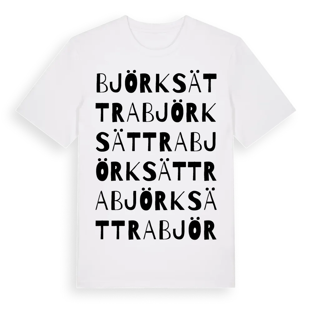 Björksättra ordlek t-shirt är inspirerad av Björksättra i Stockholms län, Sverige. Tröjan är designad för dig som har en speciell koppling till platsen – oavsett om du bor här, har rötterna här eller bara älskar Björksättra.