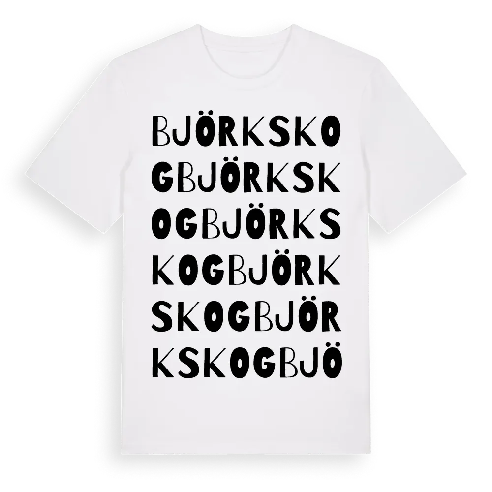 Björkskog ordlek t-shirt är inspirerad av Björkskog i Stockholms län, Sverige. Tröjan är designad för dig som har en speciell koppling till platsen – oavsett om du bor här, har rötterna här eller bara älskar Björkskog.
