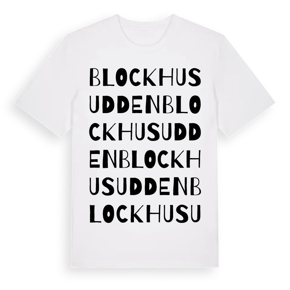 En ordlek byggd på Blockhusuddens namn. Subtilt och klurig – ett motiv som bara de som verkligen känner platsen fullt ut förstår. Premium bomull, unisex – från stadsdelen Blockhusudden i Stockholms län.