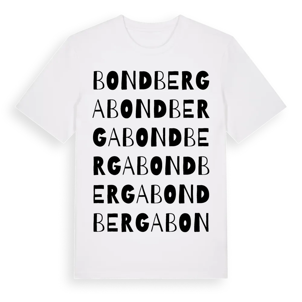 Bondberga ordlek t-shirt är inspirerad av Bondberga i Stockholms län, Sverige. Tröjan är designad för dig som har en speciell koppling till platsen – oavsett om du bor här, har rötterna här eller bara älskar Bondberga.
