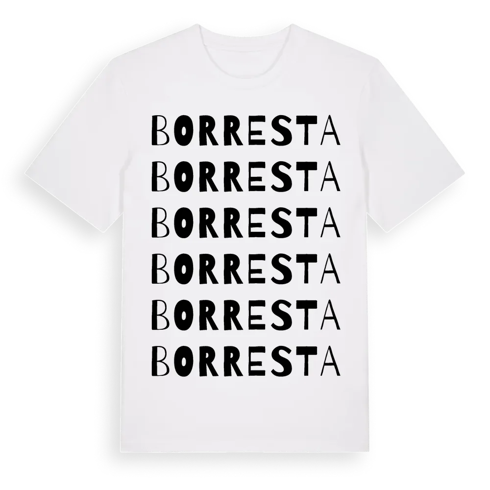 En ordlek byggd på Borrestas namn. Subtilt och klurig – ett motiv som bara de som verkligen känner platsen fullt ut förstår. Premium bomull, unisex – från byn Borresta i Stockholms län.