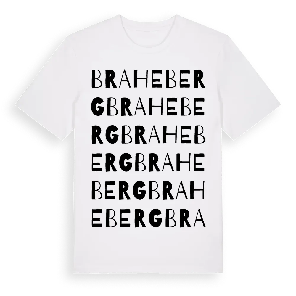 Braheberg ordlek t-shirt är inspirerad av Braheberg i Stockholms län, Sverige. Tröjan är designad för dig som har en speciell koppling till platsen – oavsett om du bor här, har rötterna här eller bara älskar Braheberg.