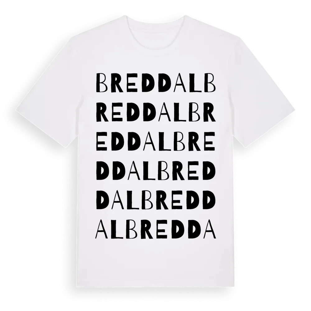 En ordlek byggd på Breddals namn. Subtilt och klurig – ett motiv som bara de som verkligen känner platsen fullt ut förstår. Premium bomull, unisex – från stadsdelen Breddal i Stockholms län.