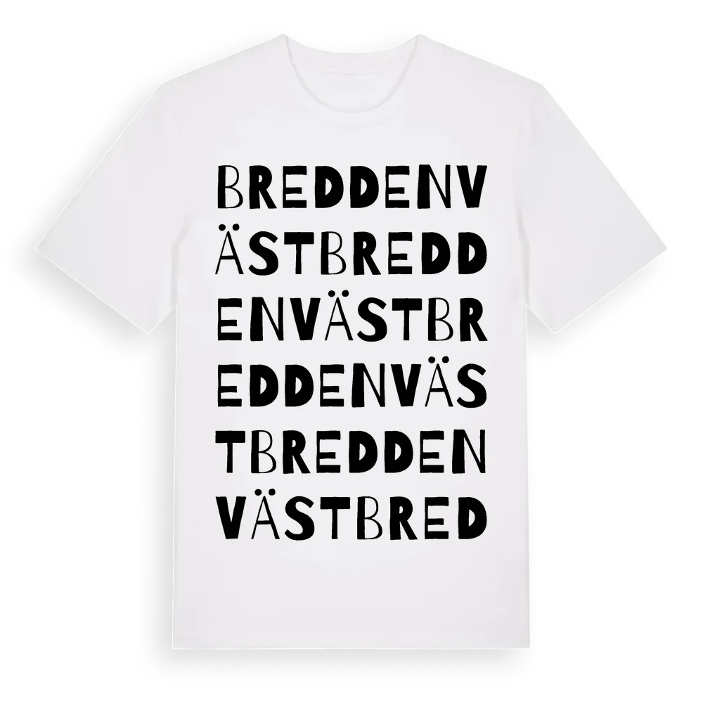 Bredden Väst ordlek t-shirt är inspirerad av stadsdelen Bredden Väst i Stockholms län, Sverige. Tröjan är designad för dig som har en speciell koppling till platsen – oavsett om du bor här, har rötterna här eller bara älskar Bredden Väst.