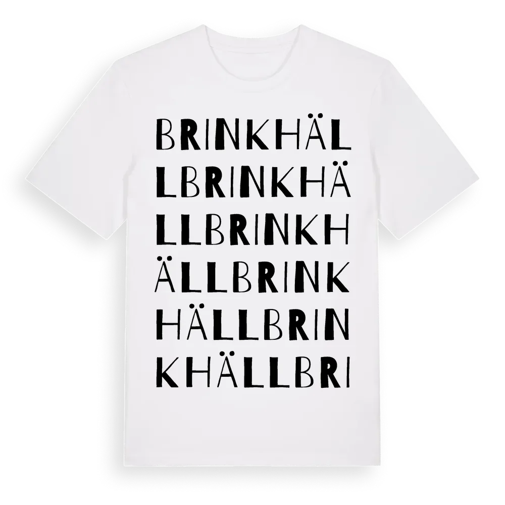 En ordlek byggd på Brinkhälls namn. Subtilt och klurig – ett motiv som bara de som verkligen känner platsen fullt ut förstår. Premium bomull, unisex – från byn Brinkhäll i Stockholms län.