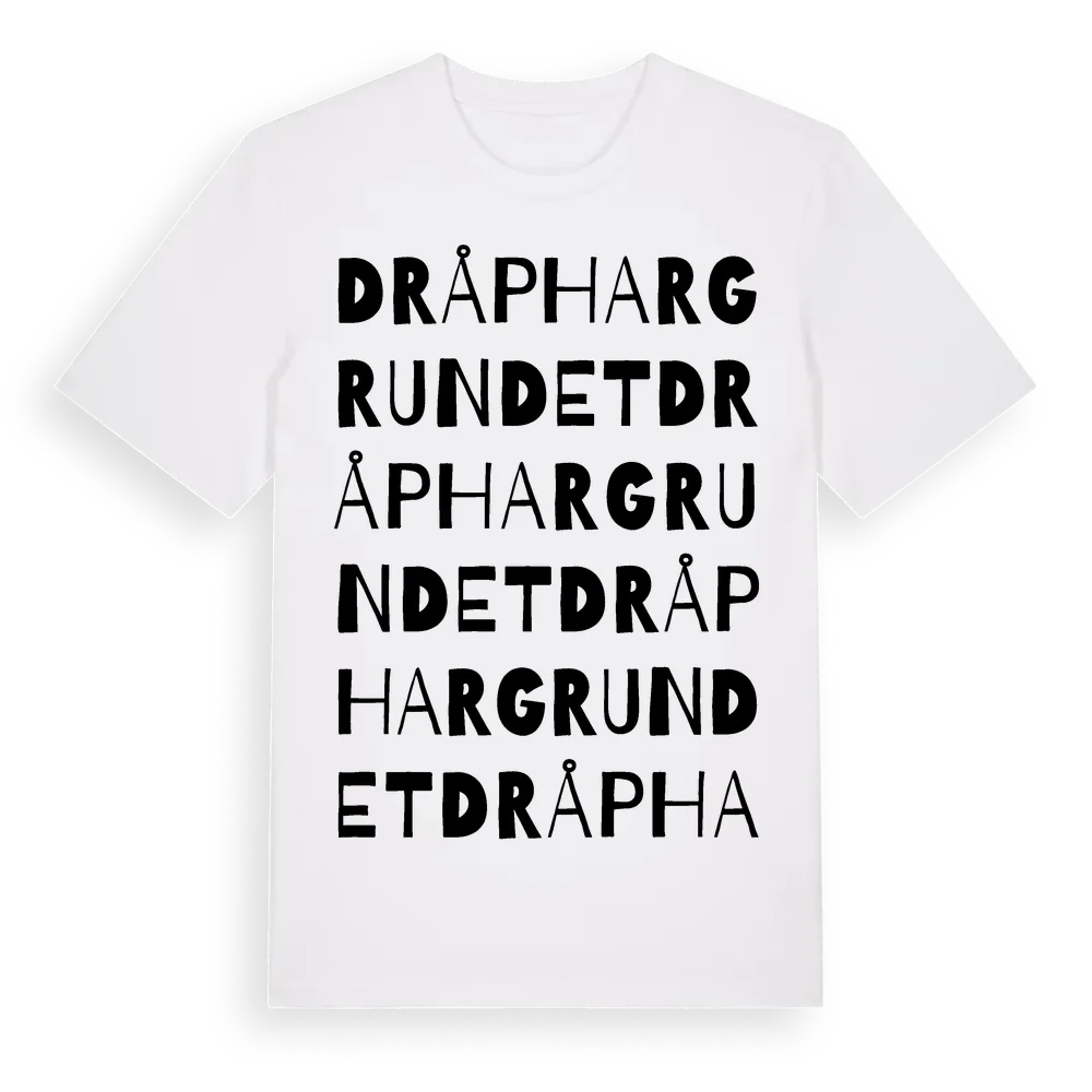 Dråphargrundet ordlek t-shirt är inspirerad av Dråphargrundet i Stockholms län, Sverige. Tröjan är designad för dig som har en speciell koppling till platsen – oavsett om du bor här, har rötterna här eller bara älskar Dråphargrundet.