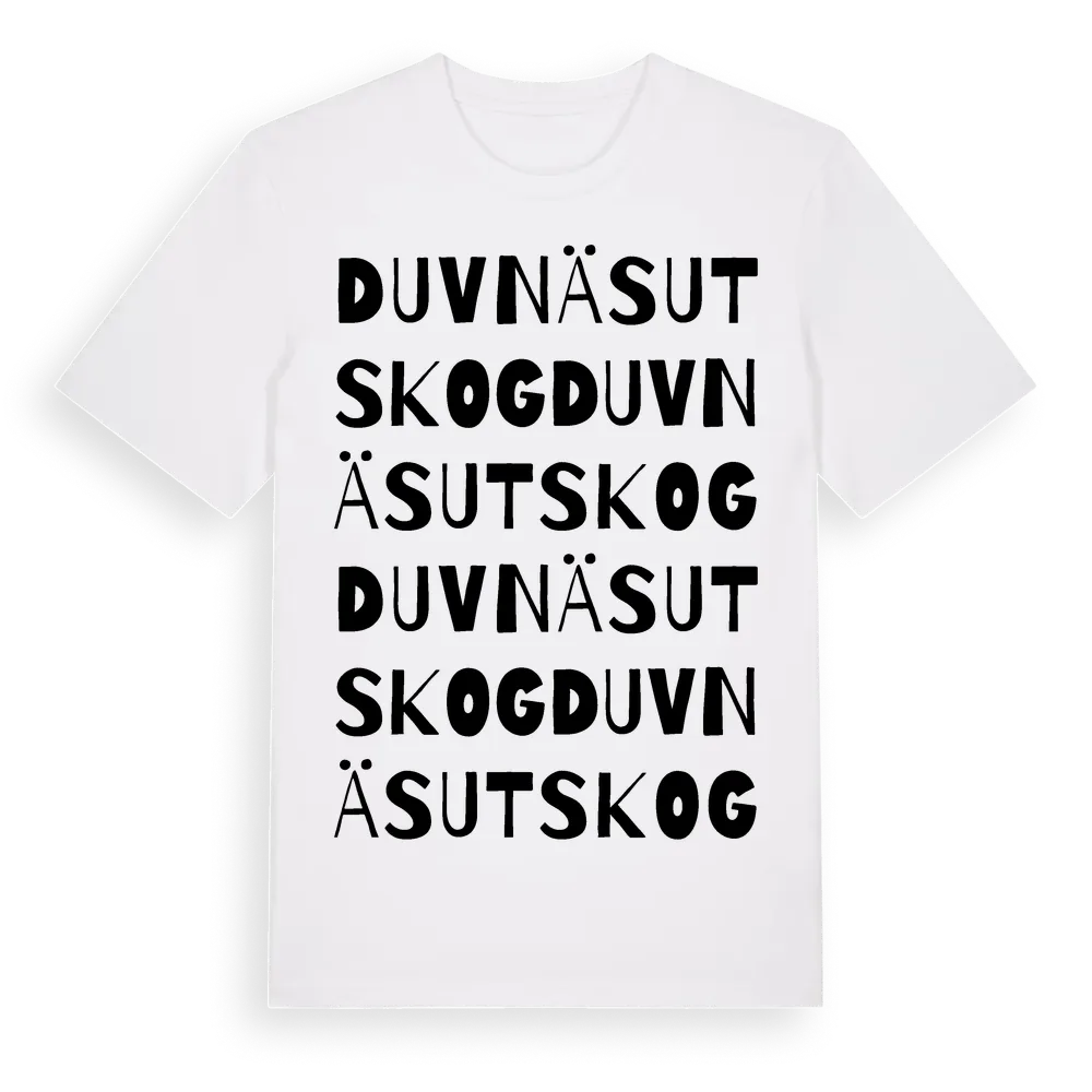 Duvnäs Utskog ordlek t-shirt är inspirerad av stadsdelen Duvnäs Utskog i Stockholms län, Sverige. Tröjan är designad för dig som har en speciell koppling till platsen – oavsett om du bor här, har rötterna här eller bara älskar Duvnäs Utskog.