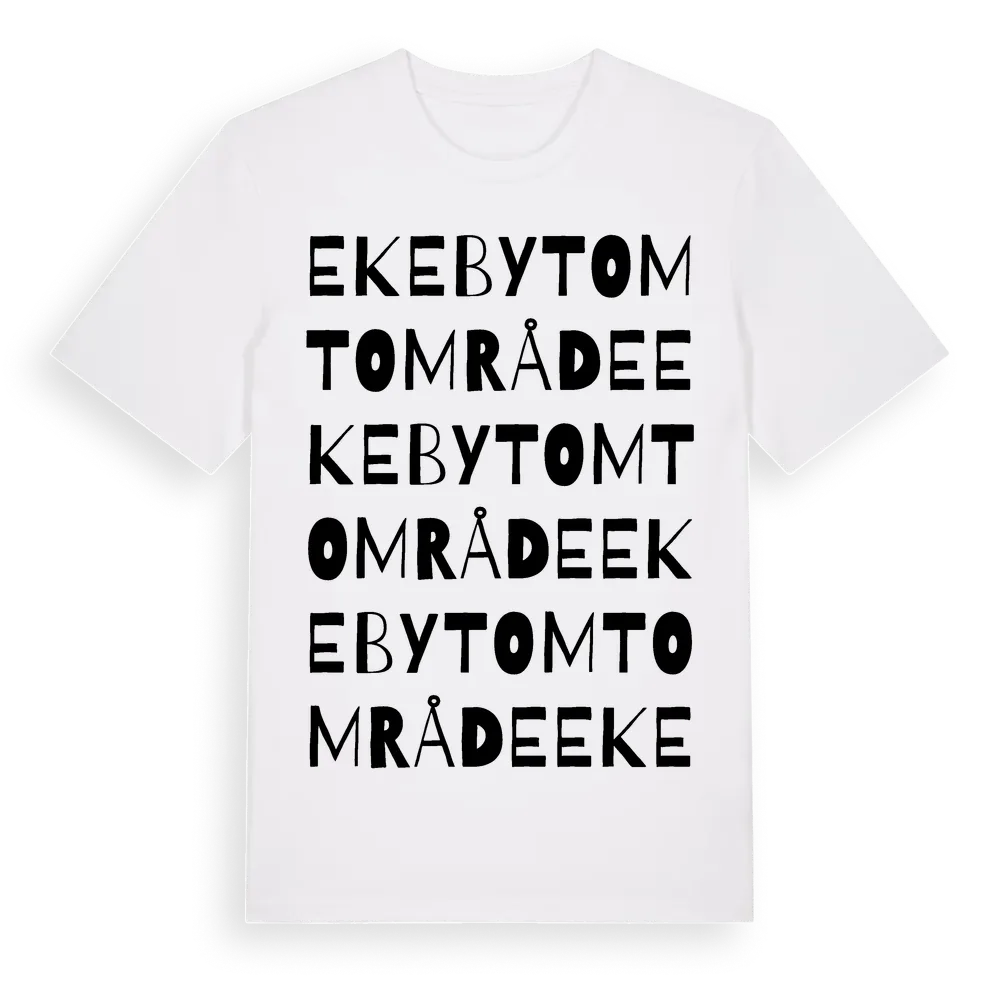 Ekeby Tomtområde ordlek t-shirt är inspirerad av byn Ekeby Tomtområde i Stockholms län, Sverige. Tröjan är designad för dig som har en speciell koppling till platsen – oavsett om du bor här, har rötterna här eller bara älskar Ekeby Tomtområde.