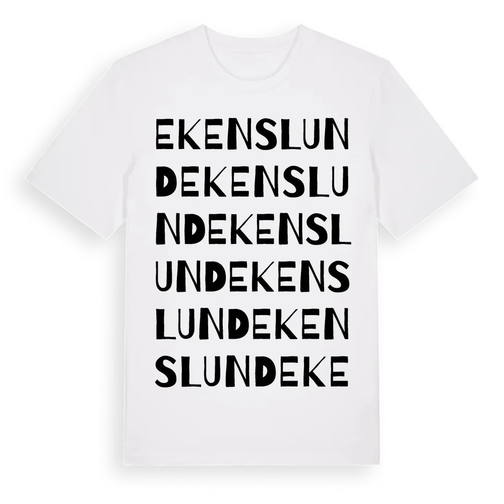 Ekenslund ordlek t-shirt är inspirerad av Ekenslund i Stockholms län, Sverige. Tröjan är designad för dig som har en speciell koppling till platsen – oavsett om du bor här, har rötterna här eller bara älskar Ekenslund.