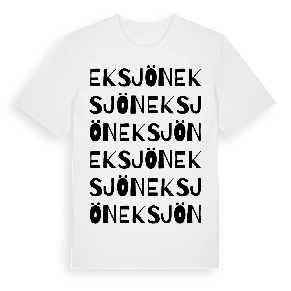 Eksjön ordlek t-shirt är inspirerad av byn Eksjön i Stockholms län, Sverige. Tröjan är designad för dig som har en speciell koppling till platsen – oavsett om du bor här, har rötterna här eller bara älskar Eksjön.